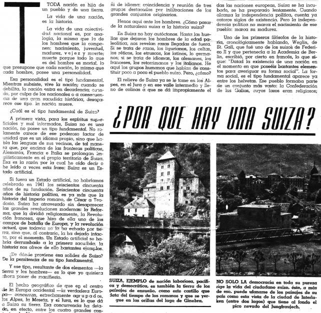 Warum gibt es die Schweiz? In den 1940er und 1950er Jahren verfolgt die Kulturpropaganda das Ziel, die staatliche Existenz der Schweiz zu rechtfertigen. Artikel von Gonzague de Reynold in der mexikanischen Zeitung Imagen, 1.1.1950.